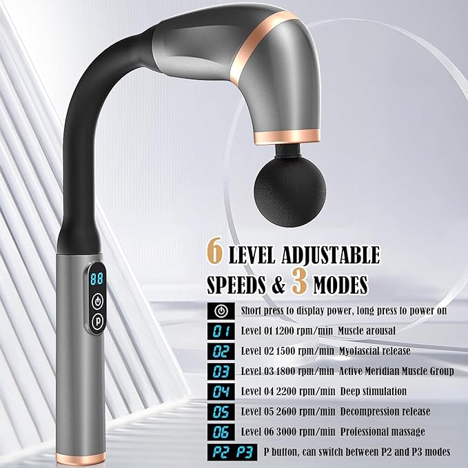 - 4 Massage Heads & 5 Speed Levels--Choose the speed that best suits your need,and change up the massagers head to more precisely target different body parts and muscle groups.The pressure point piece really gets into the right places,better relieve muscle fatigue and pain.